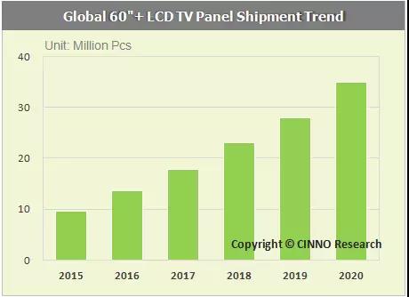 2018年BOE 10.5代線量產將推動超大尺寸TV的快速發展,CINNO Research研究數據表明,2018年60“及以上電視面板出貨量將增加至2,200萬片,2022年將超過4,000萬片,而65”和75”將為主力產品。