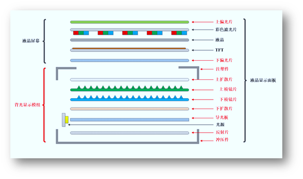 背光顯示模組,又稱(chēng)背光源,是由LED光源、導(dǎo)光板、擴(kuò)散片、棱鏡片、反射片等光學(xué)材料以及精密結(jié)構(gòu)件構(gòu)成,其工作原理為:光源射出的光線經(jīng)過(guò)導(dǎo)光板內(nèi)部光學(xué)結(jié)構(gòu)的引導(dǎo)轉(zhuǎn)換為面光源,隨后通過(guò)一系列光學(xué)過(guò)程,最終形成適合人眼觀感的光源效果。因此,背光顯示模組直接決定了液晶顯示面板的顯示效果。